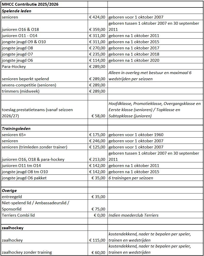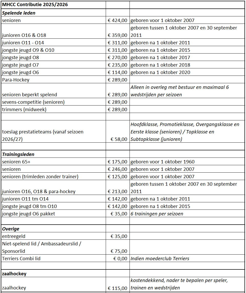 De contributie voor het seizoen 2025/2026 is als volgt: